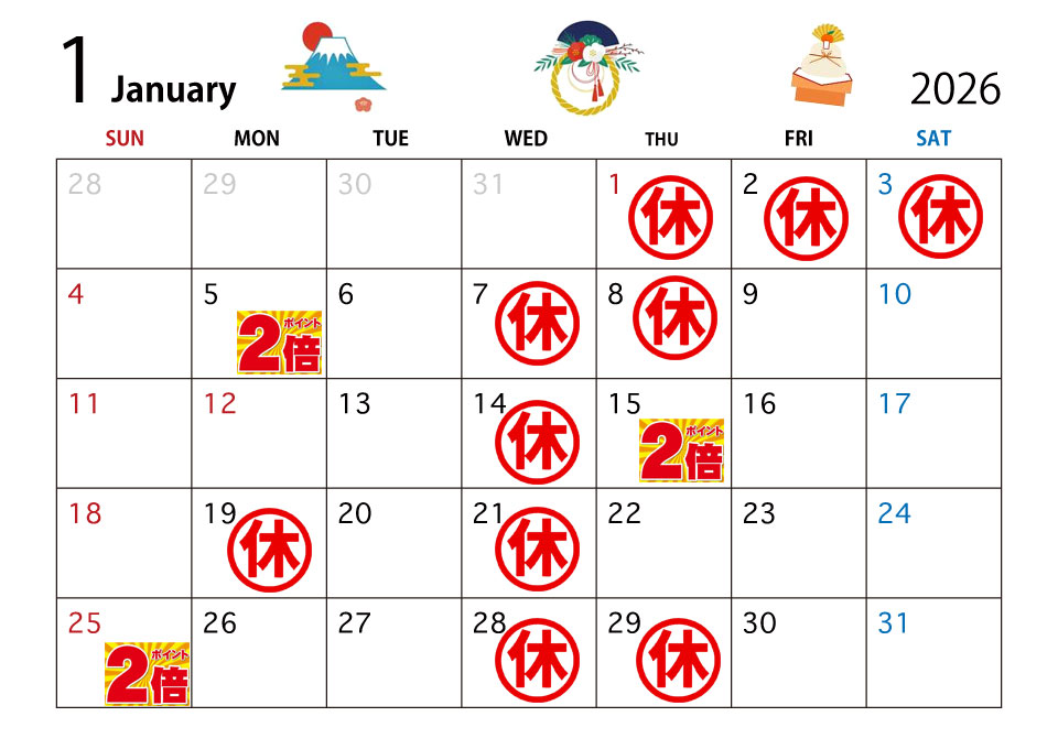 新年は3日までお休み。 4日からの営業です! ホテイヤポイント2倍デー、5日(月)・15日(木)・25日(日)です🎉 ...
